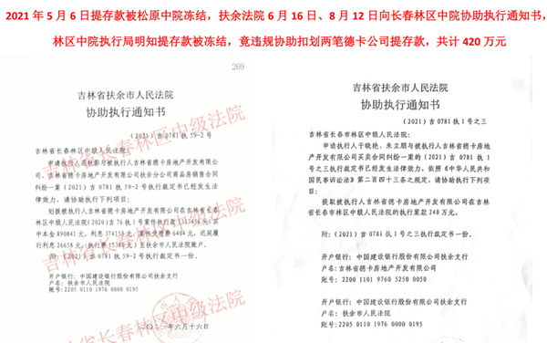 德卡公司是扶余市的重点招商引资企业,2006年进入扶余。为促进地方经济发展,德卡公司全额垫资8000多万,帮助政府建设扶余县人民医院,帮政府拆迁道路、棚户区改造并修筑了一条利民路。但是扶余市政府在德卡公司投资完后就开始耍赖不认账了,把当初的承诺和双方的协议抛至脑后,拒不兑现政府会议纪要的承诺,欠企业垫付的巨额工程款也不还。德卡公司在没有办法的情况下将扶余政府起诉,扶余政府不仅不还企业的钱,居然花700多万雇全国最大的大成律师事务所“长春分所”律师和企业打官司,德卡公司历时四年最终胜诉。长春林区法院和省高院最终判决扶余市政府支付所欠工程款和利息。德卡公司申请执行后,长春林区中院在2021年4月29日将执行案款24643489.28元扣划至该院执行款账户。恰在此时,扶余市自然资源局起诉德卡公司给付所谓的土地增容费和滞纳金,德卡公司认为此案件为典型的虚假诉讼。但该局随即就向松原中院申请保全,冻结德卡公司在林区中院的提存款,松原中院2021年5月6日作出(2021)吉07民初6号民事裁定书,5月7日向林区中院送达了(2021)吉07民初6号执行裁定和协助执行通知书,由法官助理聂子淇签收。林区中院执行一处处长何海凤,受该院执行局长闫莉主使,在冻结的提存款没有解封的情况下,违规将扶余市法院6月16日邮寄的(2021)吉0781执58-2号、59-2号、(2021)吉0781执行1号之三协助执行通知书涉及的案款协助扣划两笔,一笔180万元、一笔240万元,扣划的德卡公司提存款总计达420万元。德卡公司认为,该两起案件存在巨大争议,同类案件共计15起,德卡公司已经胜诉13起,仅两起败诉,因一二审法院明显同案不同判,该公司正在申诉,通过法律途径维护权益,林区中院在此时划走该公司420万元属于违规操作。