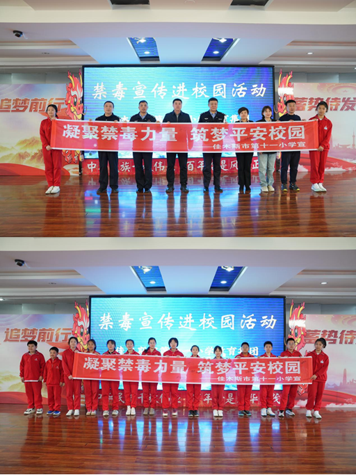 为加强禁毒宣传教育,推动平安校园建设,增强全校师生法律意识,保障依法治校工作的全面推进,守护学生平安健康成长,黑龙江省佳木斯市第十一小学教育集团联合前进区禁毒办于4月16日举行了禁毒宣传进校园活动。前进区政法委副书记、区委委员郭永,前进分局禁毒大队大队长周家佳,佳木斯市禁毒委员会宣讲团团长苏双龙,前进区法学会专职副会长柏雪,前进区禁毒大队警员何洪超、王育龙,学校领导代表,教师代表,学生代表参加了此次活动。