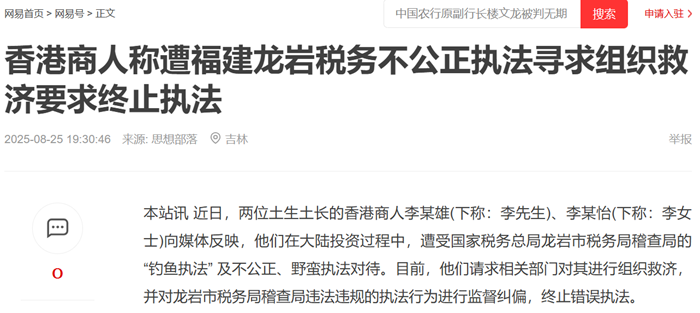 本站讯 近日,两位土生土长的香港商人李某雄(下称:李先生)、李某怡(下称:李女士)向媒体反映,他们在大陆投资过程中,遭受国家税务总局龙岩市税务局稽查局的 “钓鱼执法” 及不公正、野蛮执法对待。目前,他们请求相关部门对其进行组织救济,并对龙岩市税务局稽查局违法违规的执法行为进行监督纠偏,终止错误执法。