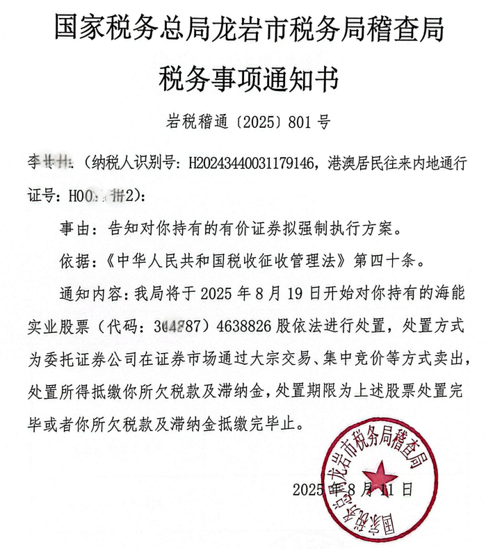 到了 2024 年,龙岩市税务稽查局突然对李先生进行立案稽查,其下属东城分局撤销了当初给欧华公司发的《清税证明》。欧华公司对此依法申请税务行政复议,之后新罗区税务局又否定了东城分局的撤销决定,原欧华公司《清税证明》至今有效。然而,2024 年 8 月,龙岩市税务局稽查局再次对李伟雄和李咚怡个人作为原欧华公司的企业所得税纳税人进行立案调查,并于 2025 年 3 月 7 日下发《税务处理决定书》(岩税稽处【2025】1 号和 2 号),要求李先生和李女士作为企业所得税纳税人按 2020 年股票市值,缴纳企业所得税。2025 年 6 月 19 日,稽查局又发出《税收强制执行决定书》(岩税稽强拍〔2025〕1 号和 2 号),次日(6 月 20 日),发布《税务事项通知书》(岩税稽通〔2025〕601 号和 602 号),冻结了二人的股票。2025 年 8 月 8 日,该局向二人持有股票的上市公司江西省安福县海能实业股份有限公司发拟于 8 月 18 日开始,对李女士所持有的股票委托证券公司强制执行处置的告知函。8 月 13 日,再发岩税稽通 [2025] 801 号《税务事项通知书》,通知 2025 年 8 月 19 日起开始对李女士持有的海能实业股票(代码:300787)4638826 股进行处置。目前,二人已无法登录自己在国金证券的股票账户,无法查看资产现状。