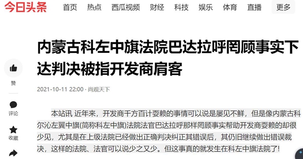本站讯 近年来,开发商千方百计耍赖的事情可以说是屡见不鲜,但是像内蒙古科尔沁左翼中旗(简称科左中旗)法院法官巴达拉呼那样罔顾事实帮助开发商耍赖的却很少见,尤其是在上级法院已经做出正确判决纠正其错误后,其仍旧继续做出错误裁决,这样的法院、法官可以说少之又少。但这事真的就发生在科左中旗法院了!