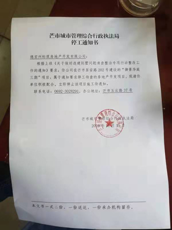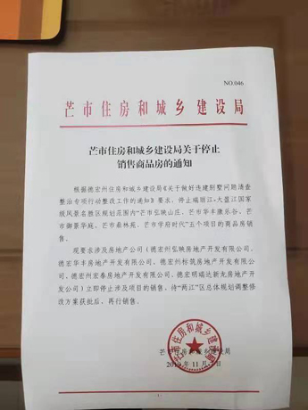 公司开发过程的所有手续均齐全合法,但于2019年11月7日,芒市住建局却以州住建局的一份内部通知将我公司项目停工停售,至今已两年多,理由是芒市的六个房地产项目涉及“瑞丽江—大盈江国家级风景名胜区”范围,全州17个项目要全部关停,等待调规完成后再动工。这对民营企业来说是灭顶之灾,所有企业至被停工停售之前根本就不知道所开发的项目涉及了风景名胜区范围。以我公司项目为例,其所在位置,四周均是已开发建设完成的项目,包括多所学校和民房等。