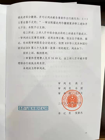 无奈之下,我公司于2020年5月份向法院提起了行政诉讼。2020年9月份,法院一审判决芒市住建局败诉,法院撤销了芒市住建局和综合执法局的停售、停工通知书;二被告不服判决,上诉至德宏州中院。二审于2021年9月6日终审判决:维持原判。还是确认了芒市住建部门行政行为违法,撤销了强制停售停工的通知。