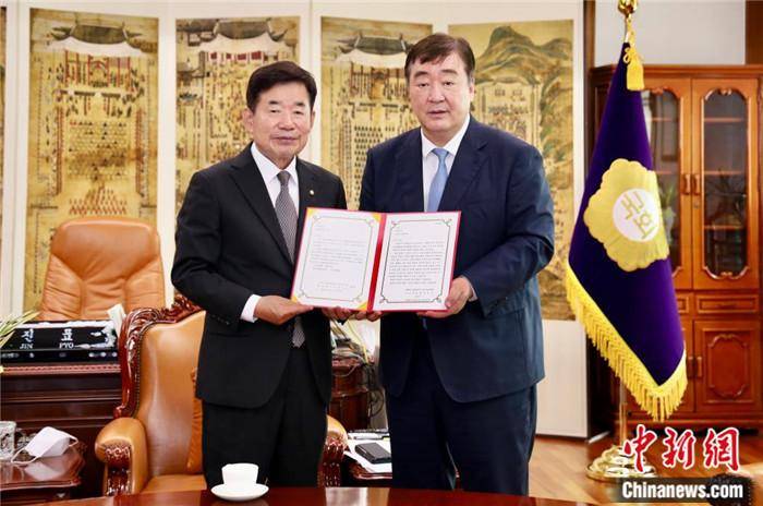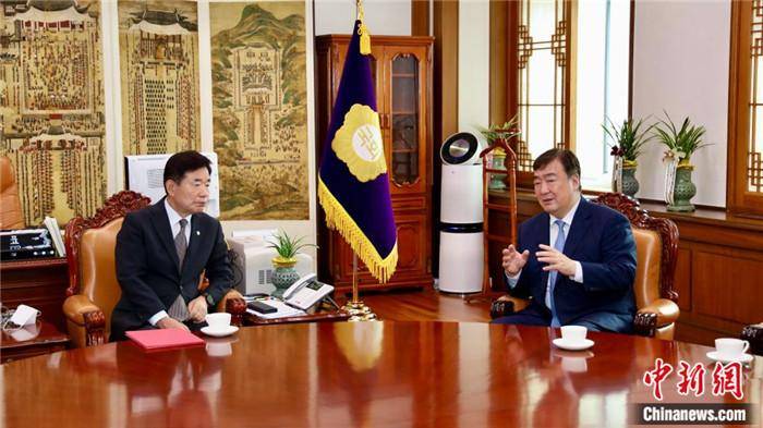 中国驻韩国大使邢海明(右)会见韩国国会议长金振杓。中国驻韩国大使馆供图