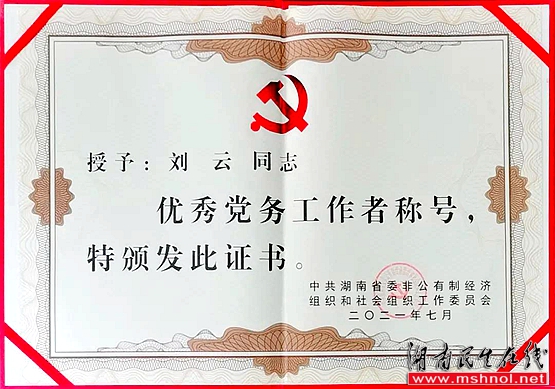 2021年7月6日,湖南省委非公有制经济组织和社会组织优秀共产党员、优秀党务工作者和先进基层党组织表彰大会在长沙召开。中共湖南省委常委、省委组织部部长王成,中共湖南省委组织部副部长陈潇,中共湖南省委统战部副部长刘事青,省民政厅党组书记、厅长、省委两新工委副书记曹忠平,省市场监管局党组书记、局长、省委两新工委副书记、省非公有制经济组织综合党委书记向曙光,中共湖南省委两新工委专职副书记罗缵吉等领导出席会议。绿之韵集团党委书记刘云参加会议,并被授予湖南省“优秀党务工作者”荣誉。