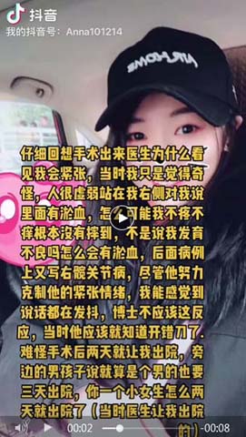 周五晚上,黄某刚医生一直没给我手术方案,也没见到他人,他的助理给我签了个字。当天很不安,没见到医生特别不踏实,但最后还是选择相信。我找人签了字就回去了,因为那个时候我可以走。下午两点的手术,出来后6小时不能进食。推进手术室的时候,我马上手术了我看医生没有换手术的衣服而是穿着白大褂,推进手术室的时候工作人员特别粗鲁,我刚准备说话就打了麻药晕过去了,都没提前说一声,还有腰以下的手术为什么要全麻。