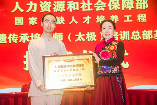 人力资源和社会保障部国家紧缺人才培养工程非遗传承培训师(总部)基地主任贺虹女士向武当和太极学院授牌作为(太极)培训总部基地, 执行院长 何强先生接受牌匾。