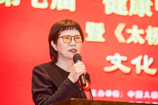 著名音乐制作人、大型舞台秀《太极图》总监制,中国康复技术转化及发展促进会副会长、原中国国际文化艺术有限公司总经理江凌女士致辞。她 表示,已连续参加了好几届的"健康中国太极文化产业”高峰论坛,虽然在疫情当前,仍抵挡不住“太极”的魅力和大家聚首海口。