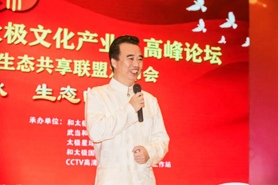 中国中小企业新零售专委会执行会长、湖北宜昌战狼企业管理咨询有限公司总裁殷祖碧先生致辞。殷总表示从第一次到武当山学习太极以来,就决定要将太极文化植入自己的企业,让更多的伙伴身心灵受益,今天也带着众多的合作伙伴参加本次论坛,希望共同将《太极星球》新零售联盟做大做强!