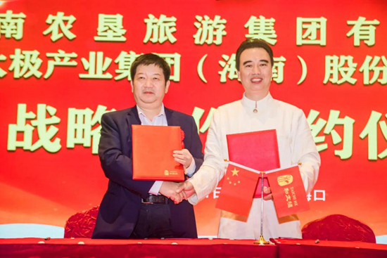 海南农垦旅游集团有限公司董事长石向荣先生与和太极产业集团 ( 海南)股份有限公司董事局主席何俊龙先生共同签署战略合作协议。