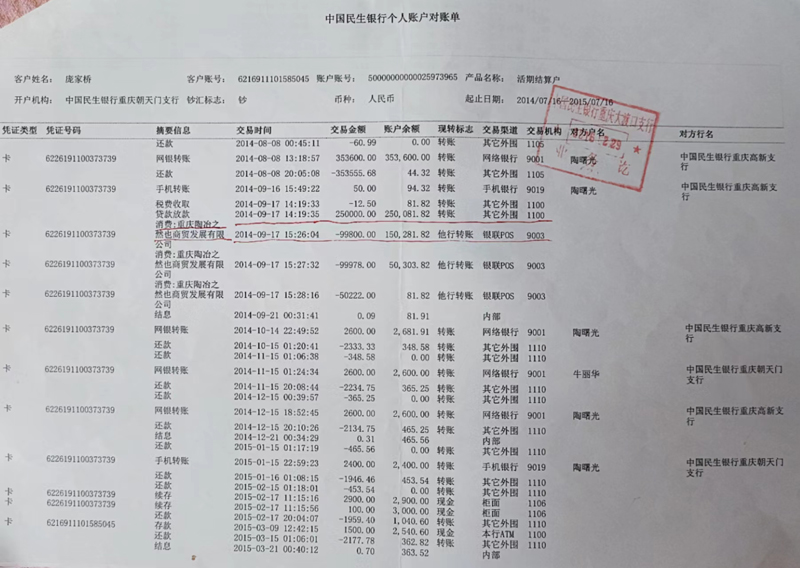 需要指出的是,我一套杨家坪住房62平方米就这么值钱吗?就给我重复的贷3次款,并且在14年,我的原始房产证还在工行抵押起的。我没有额外的收入,每个月还要帮还利息3500元是陶某光给我整的一笔车贷款,我的退休金那时才1600多元一个月。而且,在2013年7月16日这张卡就申办了,是银监局查到,民生银行小微放货公司就提前预先把卡准备好了的,373739这张卡之前就办了的,并在2013年8月8日15时57:28秒陶某光50元现金,框面16:49分02秒,税费收取16:49分03秒贷款放款,2013年8月8日16:49分03秒35万元转账,其它外围乐收银收款,个体户陶某光,网银转账。而且,民生银行个人账户对账单显示,牛某华、陶某光每个月在民生银行重庆高新支行转账还款,其它外围那时候,我玩不来手机,现在还是不懂网银转账。在2014年9月16日,又是373739这张卡续签的,又贷款25万元,贷款放款2014年9月17日14:19:35秒转账,其它外围,手机银行陶某光,消费,重庆陶冶之然也商贸发展有限公司,分3笔转走。