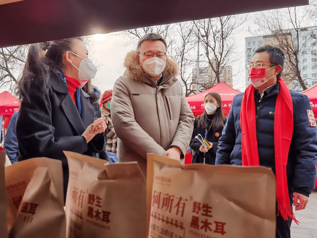 松雷文创集团、北京何所有国际商业集团副总经理刘于在市集上,向丰台区区委常委,区政府党组成员、副区长崔旭龙、丰台区东铁匠营街道党工委书记孟丹介绍来自龙江的黑土优品