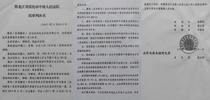 据高晓丹向媒体介绍:2015年8月24日,我任法定代表人的安达时和农业科技有限公司(以下简称时和公司)与安达市宝源奶牛养殖专业合作社(以下简称合作社)签署了《购买合作社协议》,约定合作社将“安达市宝源奶牛养殖专业合作社整体转让”给时和公司,转让价款为人民币24150000元。但是当时和公司支付了944万元转让款,并且帮助合作社取得政府补贴500万元,用牧场抵押贷款900万元,投资建设牧场1000多万元后,合作社不仅不给办理股权变更手续,合作社的实际控制人方希春还强行抢回牧场,时和公司因此于2018年10月30日,向绥化市中院起诉。