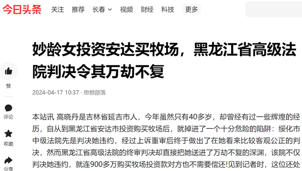 本站讯 高晓丹是吉林省延吉市人,今年虽然只有40多岁,却曾经有过一些辉煌的经历,自从到黑龙江省安达市投资购买牧场后,就掉进了一个十分危险的陷阱:绥化市中级法院先是判决她违约,经过上诉重审后终于做出了在她看来比较客观公正的判决,然而黑龙江省高级法院的终审判决却直接把她送进了万劫不复的深渊,该院不仅判决她违约,就连900多万购买牧场投资款对方也不需要偿还!见到记者时,这位还处在风华正茂时期的女人欲哭无泪。她说:“都说黑龙江黑,真是太黑了,如果仅仅是投资环境恶劣,我们还可以寻求法律公正的话,黑龙江省高院则是却把公平正义这面旗帜撕得粉碎!”
