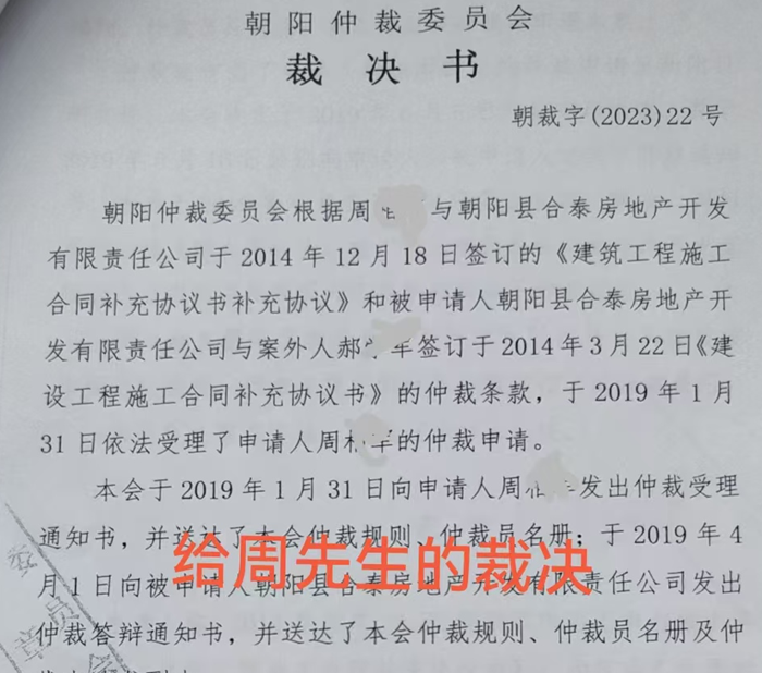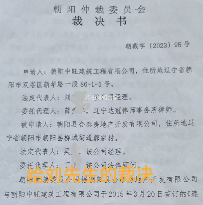 时间回溯到十年前的 2014 年春天,周先生与朝阳市的“朝阳县合泰房地产开发有限公司”签订了建筑施工合同,合同中约定,若有纠纷可通过仲裁解决,这原本是为双方矛盾化解铺设的一条法治轨道。两年多后,周先生将验收合格的工程交付给合泰公司,然而,又三年的时光悄然流逝,工程的部分尾款却如石沉大海,迟迟未到账。周先生无奈之下,来到朝阳市仲裁委员会寻求公正。
