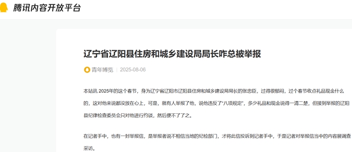 本站讯 2025年的这个春节,身为辽宁省辽阳市辽阳县住房和城乡建设局局长的张忠臣,过得很郁闷,过个春节收点礼品现金什么的,这对他来说都没放在心上,可是,就有人举报了他,说他违反了“八项规定”,多少礼品和现金说得一清二楚,但接到举报的辽阳县纪律检查委员会只对他进行约谈,然后便不了了之。