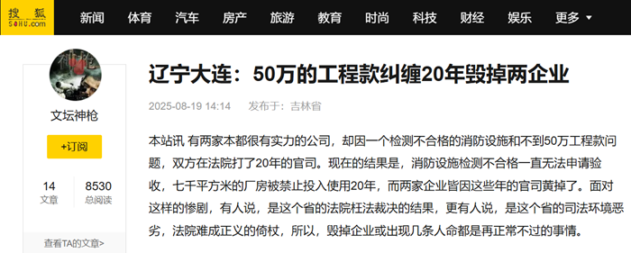本站讯 有两家本都很有实力的公司,却因一个检测不合格的消防设施和不到50万工程款问题,双方在法院打了20年的官司。现在的结果是,消防设施检测不合格一直无法申请验收,七千平方米的厂房被禁止投入使用20年,而两家企业皆因这些年的官司黄掉了。面对这样的惨剧,有人说,是这个省的法院枉法裁决的结果,更有人说,是这个省的司法环境恶劣,法院难成正义的倚杖,所以,毁掉企业或出现几条人命都是再正常不过的事情。
