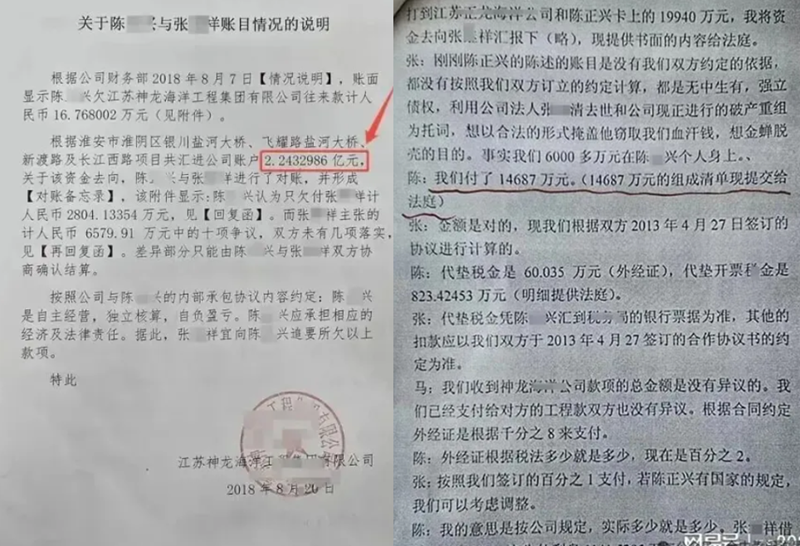 更值得玩味的是,2018年1月31日,靖江市公安局城南派出所的接出警记录显示,陈正兴在与张继祥因工程款纠纷互殴后明确承认:"我们之间争论的焦点是有个人跟张继祥有一个官司,法院让我们公司协助执行的,里面账目有6400万元。"这一陈述直接印证了其明知款项被法院冻结仍擅自处置的主观故意。特别是2018年7月31日负责破产重组的靖江法院丁峰庭长组织了一次谈话,陈正兴讲已付给张继祥1.4687亿,然而在2018年8月20日神龙海洋公司破产管理人出具给张继祥的情况说明讲其进公司帐上的2.243亿都被陈正兴拿去了,这更能应证了亭湖法院保全的6400万都在陈正兴手上。