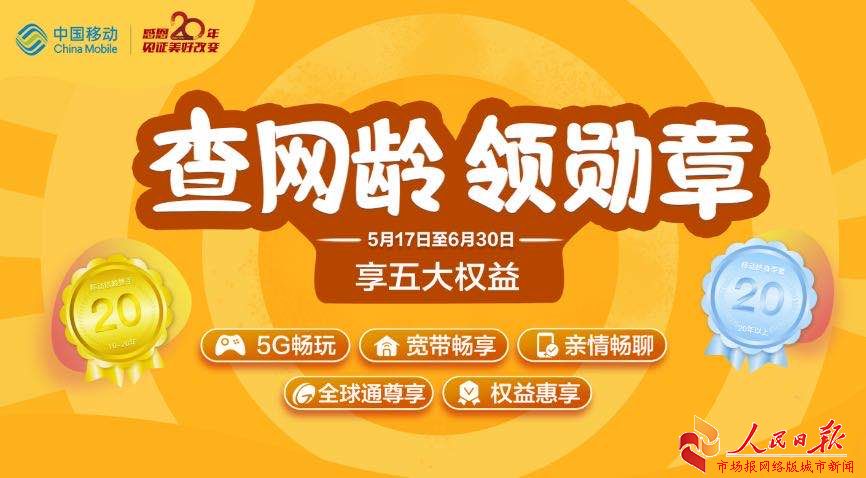 除了直播活动,移动还放出大招,在5月17日-6月30日期间,重磅推出“查网龄、领勋章、享五大特权活动”, 此次查网龄不仅能领流量,还能领会员、领国际漫游包等等众多福利,不同网龄段都可享受五大特权。从5G体验到亲情畅聊,从宽带提速到全球通白金卡,不花钱感受移动5G的速度与激情,尊享7天国漫流量包、优惠购机特权、生日当日基础通信免单、积分回馈等特权,发送“2020”至10086即可参与。