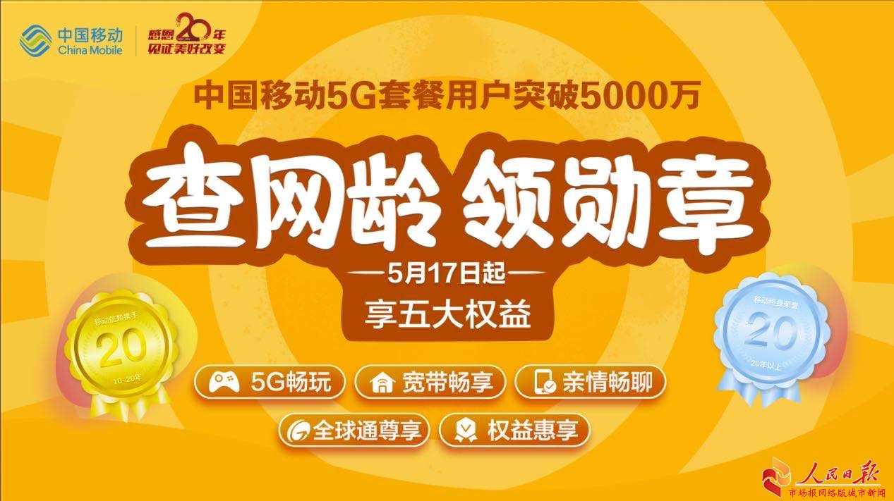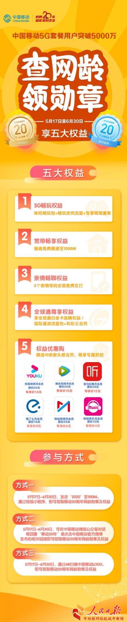 2020年,注定是不平凡的一年,同样也是中国移动成立20周年,为了感谢用户长期以来对中国移动的支持和信任,5月17日-6月30日,中国移动特别推出全新升级的“查网龄,领勋章,享五大权益服务活动”,用尊崇礼遇,为用户带来更多福利权益。