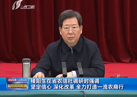 12月3日下午,省委书记楼阳生在省农信社调研,并主持召开座谈会。他强调,要深入学习贯彻党的十九届五中全会精神和习近平总书记视察山西重要讲话重要指示,不断深化地方金融机构改革,完善金融体系,强化金融监管,创优金融生态,为转型发展蹚新路提供有力金融支撑。 省领导罗清宇、李凤岐、王一新参加调研。