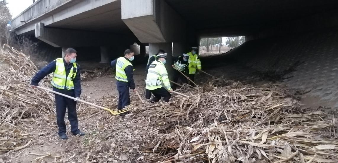 五大队民警随即对附近村民进行询问,经询问村民查证,这些玉米秸秆是有些村民为了方便处理秸秆,就近堆放在高速公路桥下,在无法找到堆放人员的情况下,五大队为及时消除安全隐患,保障道路通行安全,联合路政集体开展清理工作。在清理的同时张贴宣传标语,做好宣传工作,杜绝再有村民堆放易燃物品。至20日下午18时,共清理涵洞8处,已清理路段20公里。