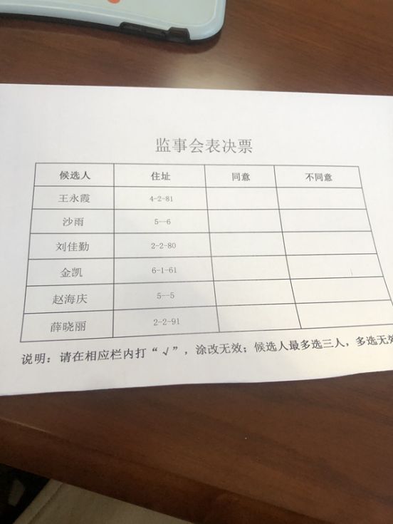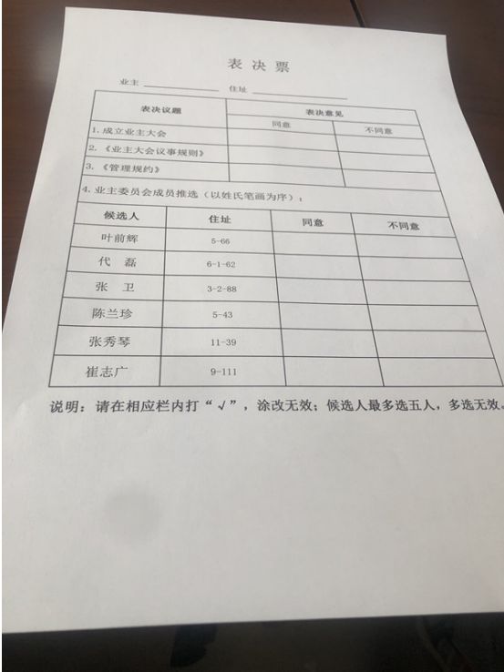 会议开始后,李海斌主任简单介绍了一下情况,并说76位业主代表均是前期由业主推选产生,原本业委会成员应在76位业主代表中选举产生,然而在选举时,业主代表拿到的是一张提前打印好的A4纸大小的《表决票》,票上有6位业委会成员候选人,要求业主代表从6名候选人中最多选5名,在对应人员名单后面打钩即可,6名候选人与筹备组成员中6名业主代表完全重合,根据现场情况,6名候选人并非选举产生,而是提前指定的人员名单。
