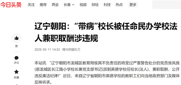 本站讯 “辽宁朝阳市龙城区教育局极其不负责任的将受过严重警告处分的党员张凤良(原龙城区长江路小学校长兼党支部书记)派到英德学校任校长(法人),兼职取酬、公开违反廉洁纪律!”近日,来自辽宁省朝阳市英德学校的教职工们向当地政府部门及媒体反映诉求。