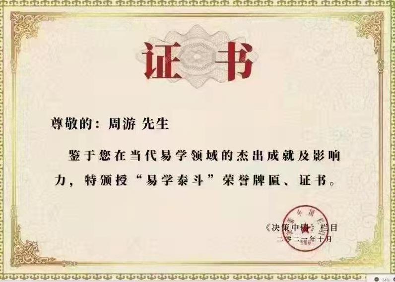周游 男 重庆市人,1958年生,1976年初学中医,1988年开始从事易经风水中医命理起名择吉33年,CCTⅤ中央电视台星光影视基地智慧中国栏目2020年电视人物访谈的中国易学风水泰斗和中国易学风水领军人物、CCTⅤ中央电视台决策中国栏目2021年授予的易学泰斗、中国专业人才发展研究中心授予的中国首席易学风水专家、中国易学风水协会会长、中国风水规划设计院院长、中国易学风水命理起名研究院院长、重庆日报资深记者编辑、教育部中国人生科学学会传统文化培训考评管理中心全国堪舆规划师培训考评管委会首席专家委员、国际易学联合会易学应用专业委员会副秘书长、重庆市周易研究会理事、重庆大学博众研究院特聘教授、俄罗斯远东国际易学研究院特聘教授、广西大学国学易经研究院副院长特聘教授、中央电视台国学频道2019年度易学领航人物、CCTV中央电视台决策中国联盟副理事长、上海市社会经济文化交流协会易经文化研究会专家团易经风水专家、千亿上市公司金科龙湖风水名师,为金科、龙湖、万科、碧桂园、格力、融创、绿城、保利、旭辉、荣盛、奥园、远洋、绿地、中海、龙光、金茂、富力、中梁、美的、融侨、和记黄埔、香港置地、三盛、中俊、华侨城、华远、东原、协信、华宇、中冶、红星、财信、中科、新科、大江、渝发、海博等上万多家企事业堪舆风水择吉取名,为十多万人作堪舆风水命理起名择吉服务,成效显著。
