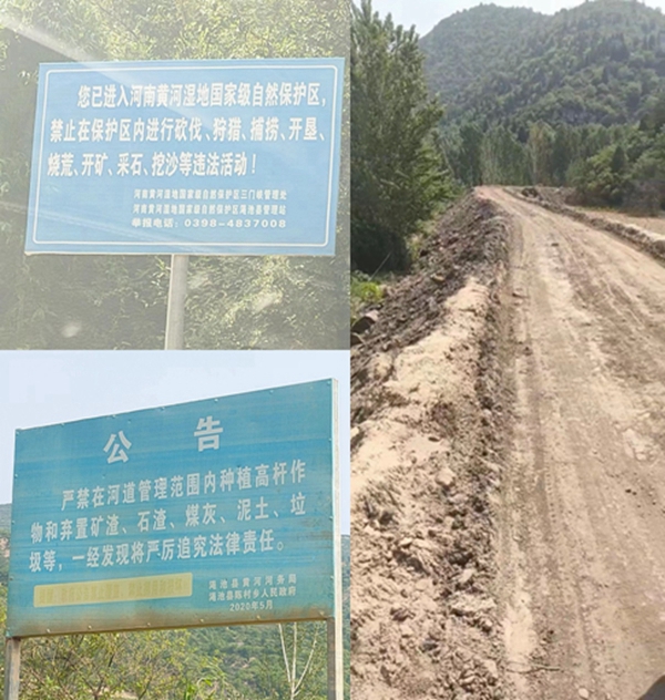 黄河汛期前,记者多次进入渑池县陈村乡槐扒村的黄河提灌工程区域进行实地调查取证,在陈村乡水泉洼村,距黄河主河道一百五十米处,也正是国家黄河湿地自然保护区内,有一个“义正诚矿业有限公司”旗下的“渑池县宇航矿业有限公司”井采区,该矿区属于黄河湿地自然保护区,矿区入口处很明显的立着一块政府的告示牌“严禁在保护区内进行开矿、采石、挖沙……”,不远处另一块公告牌告示“严禁在黄河河道范围内弃置矿渣、石渣、煤灰、泥土、垃圾等,一经发现严厉追究法律责任”。可记者看到的是,该矿区内还有大片没有恢复植被的明采区,植被毁坏严重,井采区也有部分林木草皮毁坏。更为严重的是,矿区出口有一条用矿渣填埋的简易运送矿石的路,路长五百多米,路基宽九米左右,路面宽四米有余,路高近四米,此路通过黄河湿地保护区一直延伸至延黄公路处,整个简易运矿石的路都是用矿渣铺成,矿渣填充入黄河湿地自然保护区内,其非法对湿地自然保护区填埋矿渣容积之大,让人瞠目,对湿地内政府公告牌内容视若不见,政府公告形同虚设,让人费解,其对湿地自然保护区破坏之严重,让人惋惜!