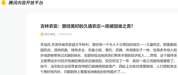 本站讯 在吉林省农安县太平岭村,曾经有一个令人十分想往的地方——久盛农庄,那里集田园风光、湿地风貌、绿色农业、农家小院、垂钓、采摘、休闲娱乐于一体,给很多本地人和外地游客带来过无限的快乐,也曾经给当地农民们带来丰厚的经济收入......然而,这个既环保又能带动乡村经济发展的美丽农庄建成后,仅仅存活了一年,就在一夜之间被彻底摧毁了。如今,当年的企业经营者宫坤妮已被搞得倾家荡产,四处上访告状索要赔偿,人们想起来这个美好地方时,只能到网上看看当地电视台的专题片了......