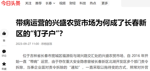 位于吉林省长春市宽城区福源街与湖兴路交汇处的兴盛农贸市场,自 2016 年开始一直“带病”运营,由于存在重大安全隐患曾被长春新区北湖开发区多个部门责令拆除,当事企业面对责令拆除的“通知”,一直采取以拖待变的方式,照常对外营业。