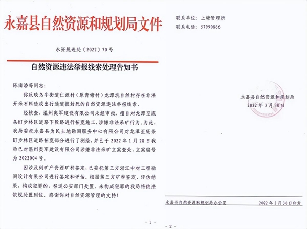 至今,我们举报此事已长达3个年头,期间,永嘉县自然资源和规划局于2022年1月28日已经对温州奥军建设涉嫌非法采矿立案查处(立案编号为2022004号);并于同年3月30日发文——永资规违处[2022]70号《自然资源违法举报线索处理告知书》(简称为《告知书》)。