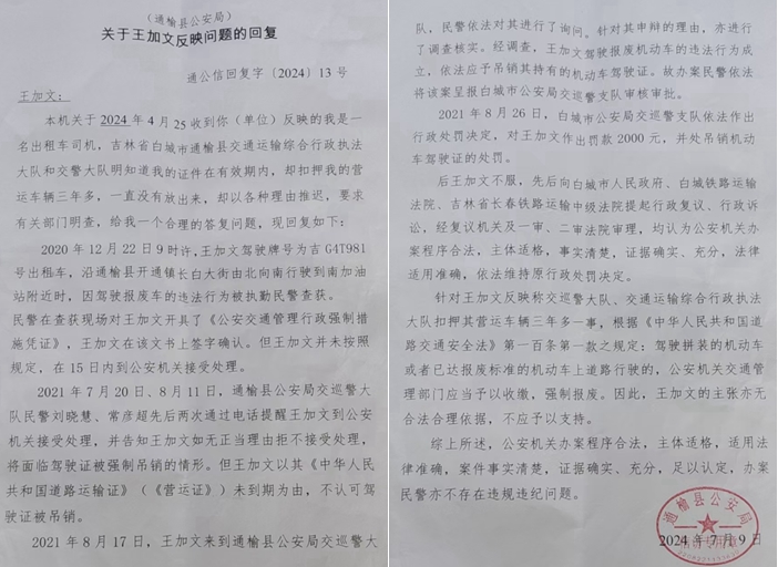 王加文提供的《通榆县公安局关于王加文反映问题的回复》(通公信回复字[2024]13号)对此事是这样记述的: