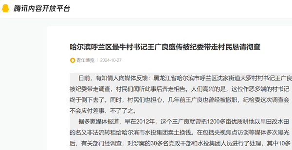 据多家媒体报道,早在2012年,这个王广良就曾把1200多亩优质耕地以旱田改水田的名义非法流转租给哈尔滨市水投集团卖土换钱。在包括央视焦点访谈等媒体多次曝光后,有关部门经调查,对涉案的30多名党政干部和水投集团人员进行了处理,其中10多人被追究了刑事责任,而王广良只是受到党内警告处分,之后又东山再起重新担任村书记。2024年7月1日以后,大罗村村民们再次举报其将5000亩承包地私自改成村集体机动地,将4700多万元补偿款长期扣押。据称,呼兰区纪委已经立案,这次纪检委调查后,王广良会不会东山再起?这成为大罗村村民们心头的一块心病。