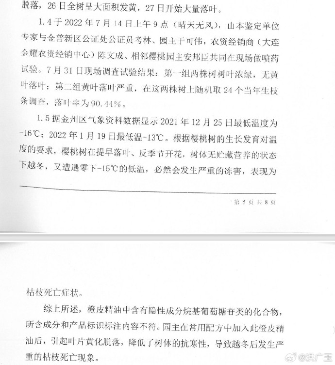 2022年,大连市发生了大面积的樱桃树死亡事件,涉及到的大种植户有宫梁术、纪小卫、王永福、王盛治、王盛明、曹宇、于可伟、张红等8户(图1:报案时合影),初步统计至少有1630亩樱桃树全死了,经司法鉴定的损失超过5000万元。这部分有名有姓,任何人都可以查证。