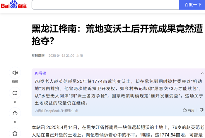 本站讯 2025年4月14日,在黑龙江省桦南县一块偏远却肥沃的土地上,76岁的赵英范老人站在自己开垦的土地上,向记者倾诉着心中的不平。“瞧瞧,这1774.54亩地,可都是我一点点开垦出来的。以前这里常闹水灾,根本没人瞧得上,现在水害治理好了,土地肥沃了,就都想来抢。我开发的是荒地、荒沟,可村书记硬说这是机动地,重新发包时居然把我排除在外,哪有这样的道理?!”虽已年近八旬,老人说起话来依旧底气十足。