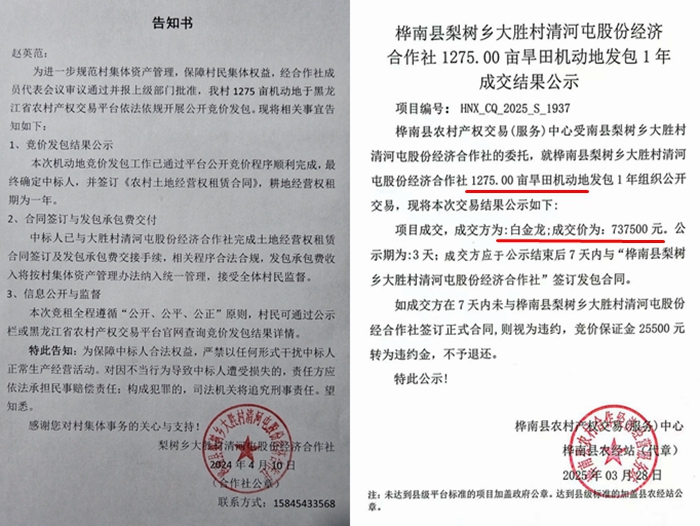 赵英范本以为,经过两级法院的审理判决,事情已经尘埃落定,可没想到村委会又出新招。2025年3月1日承包合同到期后,村委会重新发包时,竟以土地是村里的机动地、只能包给本村人为由,将赵英范排除在外。最终,包含赵英范开垦土地在内的1275亩地,以每年737500元的价格承包给了白金龙。