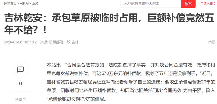 本站讯 “合同是合法有效的,法院都查清了事实,并判决合同合法有效,政府和村里也每次都说给补偿,可这578万余元的补偿款,我等了五年还是没拿到手。”近日,吉林省乾安县乾安镇居民杜立军向记者倾诉了自己的遭遇:他依法承包经营近20年的草原,因临时用地产生巨额补偿款,却因当地相关部门以“合同无效”为由干预,陷入“承诺给钱却长期拖欠”的僵局。