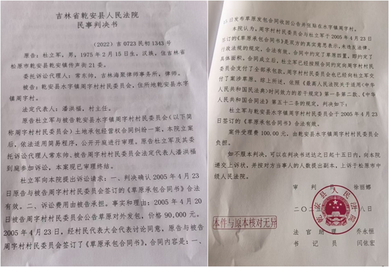 据杜立军介绍和乾安县法院(2022)吉0723民初1343号民事判决书记载:2005年4月,乾安县水字镇周字村通过公告形式对外发包村西甸子草原,由于本村村民无人报名,非本村村民的杜立军报名承包。经村民代表大会同意后,他与周字村村委会签订了《草原承包合同书》,一次性缴纳9万元承包费,并完成了镇政府备案、公证处公证,最终获得乾安县政府核发的《草原承包使用证》,明确承包面积为434.1公顷。这片被定为第四等级的草原多为盐碱地,此后近20年里,杜立军持续投入大量人力、物力和财力进行经营打理。