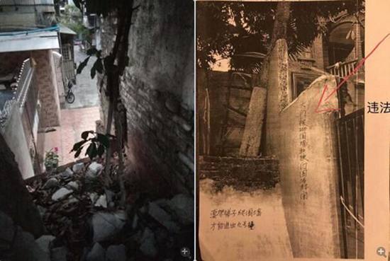 记者了解到,2017年7月29日被告第一次擅自在罗占章对门的102房北边墙根处修建东西方向约8米长的不锈钢围栏(铁门),把双方门口全部巷子围蔽在围栏铁门之内,包括法院判决“最西侧处”出口,阻断了罗占章一家人的进出之路。罗占章拍下了被告当时围蔽巷子铺地砖、贴瓷片摆桌椅做起花园的证据照片,投诉到当地城管规划部门。同年11月10日,越秀区农林街道综治办依法拆除了被告自建的违法围墙。