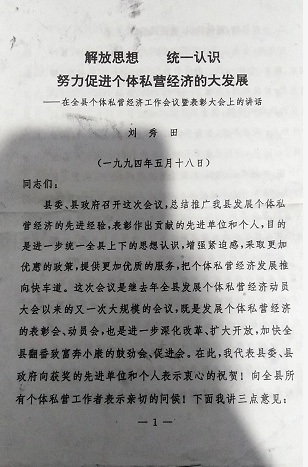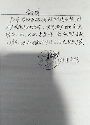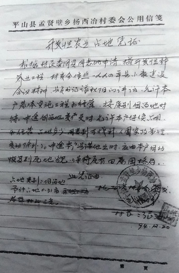 1994年,小康建设工作组来到我村,带着1994年5月18日的县里文件,落实国家在农村的富民政策,让农民发展二、三产业、多种经营、乡镇企业等多种优惠政策,并号召党员起带头作用。我的父亲李某锁是一名共产党员,起带头作用,积极响应国家政策,在工作组和村委会的领导下签订开发性农业占地凭证,开始发展养殖业。当时实行自由兑换土地,为了不影响他人耕种,我们与他人协商换地,换好地后在签订合同的地上进行建设。