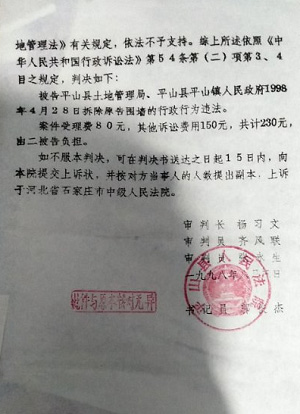 1998年,村民杨某小仗着上面有人,找平山镇土地所、平山县土地局在没有任何法律文书的情况下,带着20多人强行拆除了我们的养殖围墙,并在电视台给我们曝光。后来我们告到法院。1998年8月3日判决如下:被告平山县土地管理局、平山县平山镇人民政府1998年4月28日拆除原告围墙的行为违法。但土地局却又对我们做出处罚——土地违法案件行政处罚决定书(平政土罚字[1998]第13号)。我们不服,告到法院。1998年11月3日,法院判决如下:撤销被告平山县土地管理局1998年8月5日所作平政土罚字(1998)第13号土地违法案件行政处罚决定书。后土地局不服,提出上诉,进行二审,判决如下:驳回土地局上诉,维持原判。