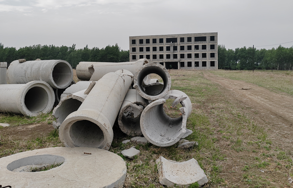 如今,园区内有半数以上企业属于“僵尸”状态,有部分企业处在停产半停产状态,许多企业院内耕作农田,还有的企业院落杂草众生。烂尾楼院落杂七杂八散落着破损的水泥管材……整个园区一眼望去是破败迹象。