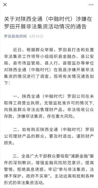 值得一提的是,2020年4月30日,湖北省罗田县政府网官方微信公众号发布通告称,根据群众举报,罗田县打击和处置非法集资工作领导小组组织县金融办、县公安局、县市场监管局、县人行、县银监办等单位对陕西全通(中融时代)在罗田县涉嫌开展非法集资的情况进行调查发现,陕西全通(中融时代)罗田公司在未取得工商营业执照,无银监批准许可的情况下,向罗田县群众非法出售理财产品,非法吸收公众存款,涉嫌非法集资,存在重大风险。