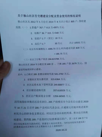 这么长时间楼房不建设,在205户村民强烈要求下,于2020年10月21日村委召开了楼房收支情况公布会议,公布楼房资金,账目明细居然205户缴纳的楼房款2679万元现在只剩下1365多万元。楼房还没建设就已经花掉1300多万元。所谓购买楼房钢筋500多万元,在没有建设楼房的土地情况下,怎能就买下这么多钢筋放在那里呢?这么长时间都已成为一堆废铁;已建完居住的1期2期社区所有设施费用也是从我们205户所缴纳的楼房款中支出,这样合理吗?