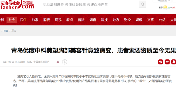 青岛优度面临公司出现的纠纷问题,将选择如何面对呢?中科美塑品牌是否隶属于青岛优度?中科美塑产品是否具有相关行业资质?王女士的乳腺癌究竟和注入中科美塑针剂有无关联?