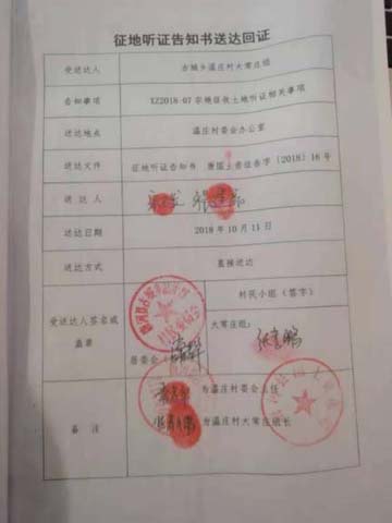 经多方了解和查证,早在2018年10月,唐河县大运新能源有限公司加气项目地址选在了我所承包的耕地位置,并有唐河县土地局和古城乡政府为该公司办理征地手续。征地手续上有唐河县古城乡温庄村支书常某华弄虚作假,伪造的征地材料:由常某华在拟征地告知书、征地听证告知书等送达回证上假冒、伪造我的签证(指印)。