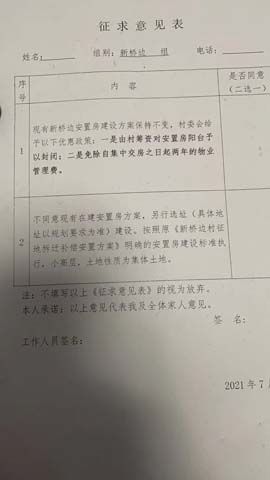 其四,村委会2021年7月24日印发了征求意见表,村里工作人员每天晚上走乡串户一对一签此表,大半夜打扰了村民休息,村民要求去村里签。25日和26日,村民到村委会要求签署自己的意见,工作人员却避而不见,村支书解释说安排的有专人专班下户。2021年7月27日,接到村里的通知去签征求意见,要求必须按意见表二选一。因实行高压态势与拆迁村民发生了冲突,影响了社会的和谐稳定。
