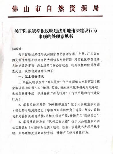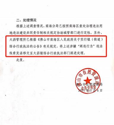 佛山市南海区城市管理和综合执法局(南城管信〔2021〕28 号) 《佛山市南海区城市管理和综合执法局关于陆啟斌等人信访事项的答复意见书》答复:“上述两处涉嫌违建物的处理不属我局职能范围,我局已将上述线索发函至相关部门跟进处理。”